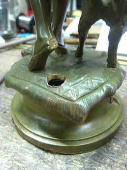 Ce bronze a été percé pour un montage électrique.... Le trou a été rebouché, le talon reconstitué et une retouche de patine est venue finir le travail