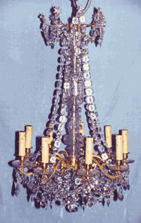 Démontage des cristaux et du lustre. Redressage et vérification du montage de celui-ci. Décapage, vernissage façon dorure des bronzes et lavage des cristaux. Remontage après décor, électrification aux normes européennes. Les cristaux sont enfilés sur épingles de maillechort. Ici ce sont des cristaux baccarat.